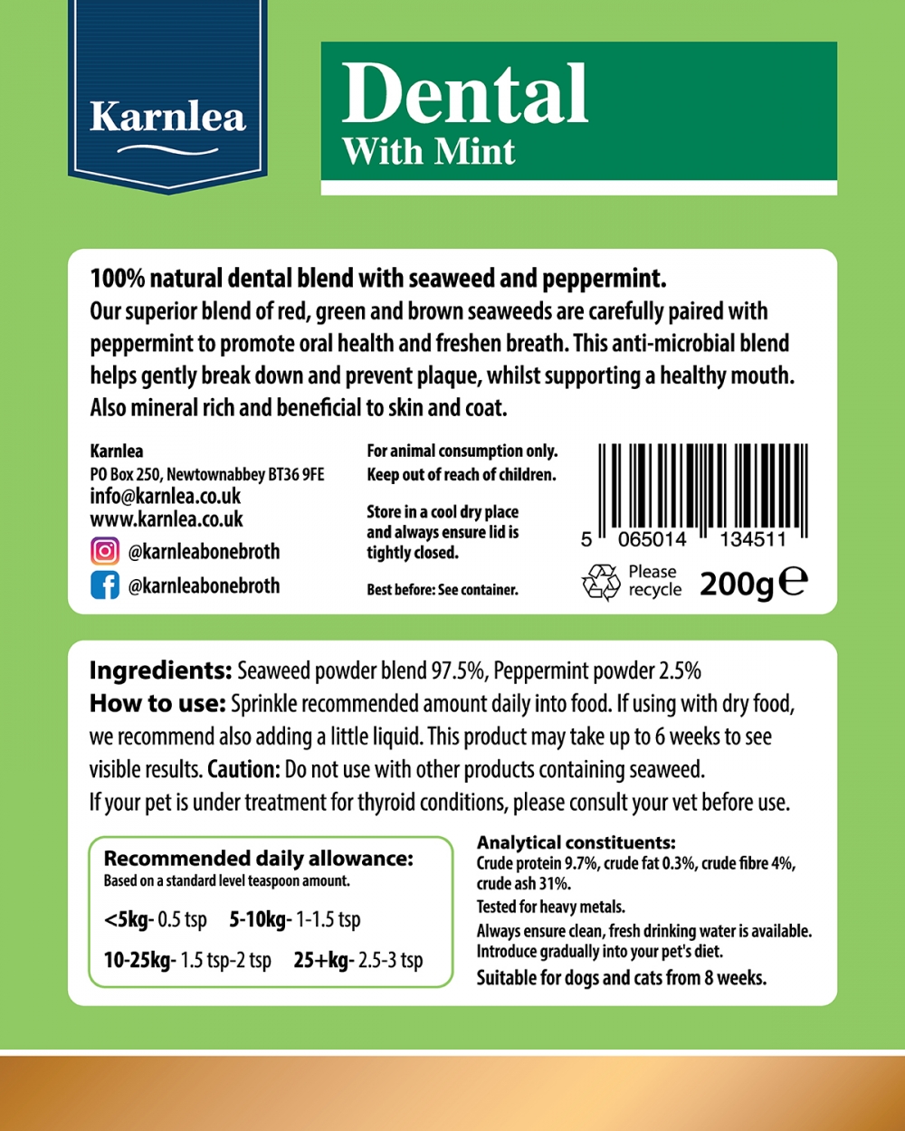 Daglige tannpleie for hunder og katter består av en nøye utvalgt og blandet blanding av rød, grønn og brun tang med mynte. Hver av dem er inkludert på grunn av fordelene sine for kjæledyrets orale mikrobiom.