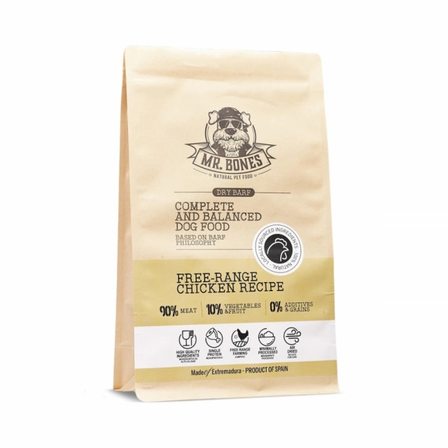 Mr. Bones Kylling (Dry BARF Chicken) er et naturlig og svært næringstett hundefôr utviklet i tråd med et balansert BARF-inspirert kosthold. Oppskriften kombinerer muskelkjøtt, utvalgt innmat og kyllingskrog – slik hunden får et måltid med tydelig råvareprofil og et bredt spekter av essensielle næringsstoffer. Dette er et fôr for deg som ønsker et kraftfullt, smakfullt og funksjonelt alternativ – med mye næring i hver bit.