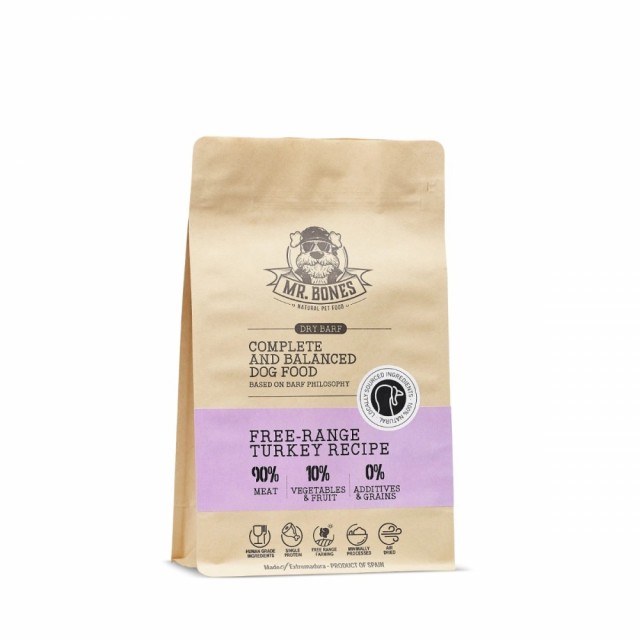 Mr. Bones Kalkun (Dry BARF Turkey) er et naturlig og næringstett hundefôr laget av kalkun, utviklet i tråd med et balansert BARF-inspirert kosthold. Dette er et kokt naturlig fôr som kombinerer muskelkjøtt, utvalgt innmat og bein/skrog – slik hunden får et komplett og næringsrikt måltid med tydelig ingrediensliste og høy smakelighet.