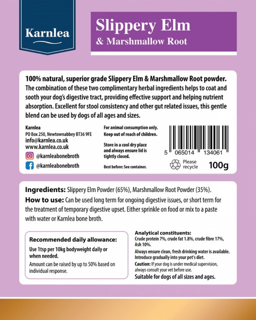 Karnlea pulver av Slippery Elm (Rødalmbark) og marshmallowroot (Legestokkrose) av høy kvalitet er en blanding av to naturlige urteingredienser, som kan hjelpe med fordøyelseshelse og luftveisproblemer. Sammen er de et kraftverk som kan være nyttig for å berolige fordøyelseskanalen. De kan også hjelpe mot hoste og luftveisproblemer på grunn av deres lindrende gellignende egenskaper når de er våte.