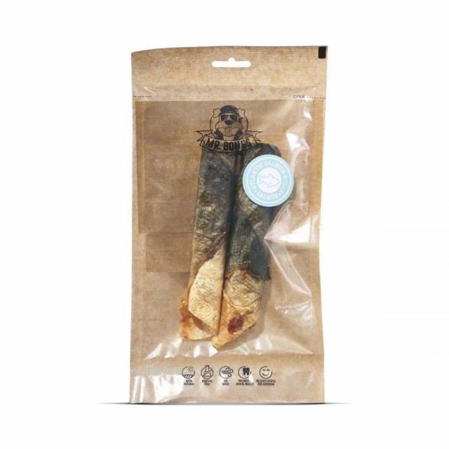 Lakseruller for hunder er naturlige tannkjøttsnacks , laget kun med dehydrert laks (kjøtt og skinn), og bevarer dermed alle næringsstoffene, aromaene og de naturlige smakene.