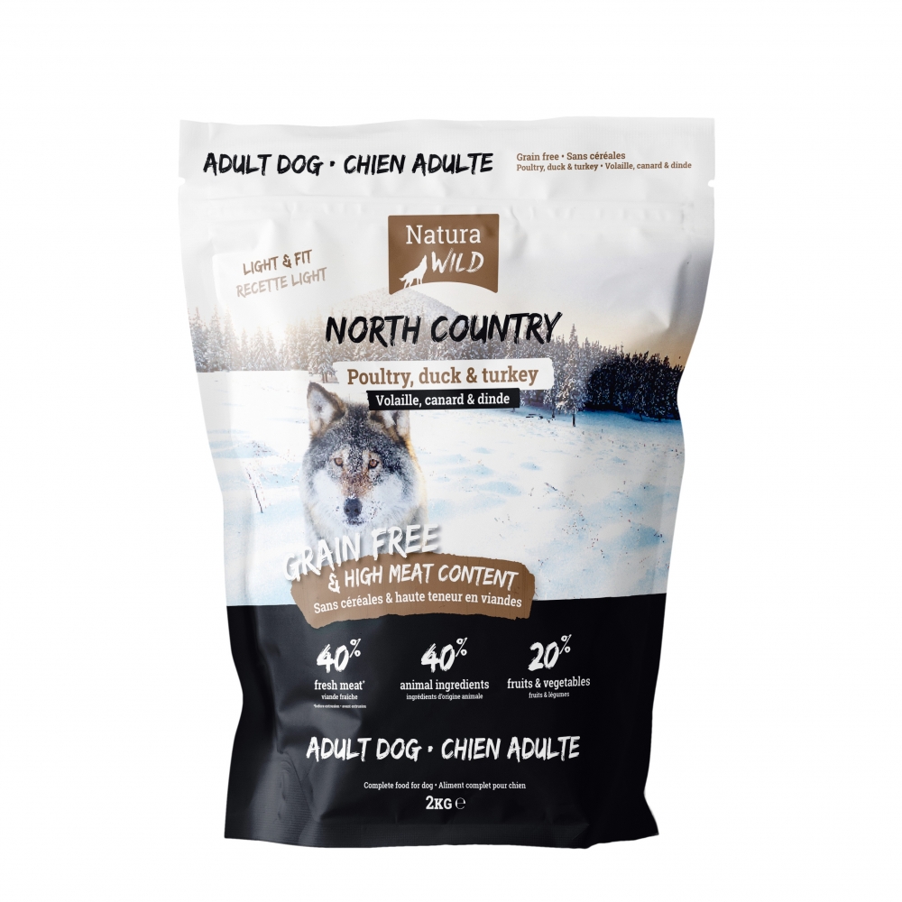 Velg et kornfritt kosthold med NATURA WILD North Country, en lett oppskrift laget med fersk kylling (40 %), supplert med 40 % animalske ingredienser (and og kalkun) og 20 % frukt, grønnsaker og urter. Ideelt når du trenger vektkontroll.