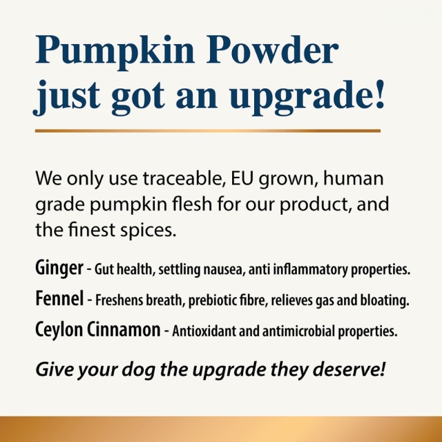 Karnlea-gresskarpulver er ikke-GMO, dyrket uten sprøytemidler, og inneholder ingen tilsetningsstoffer, konserveringsmidler eller billige fyllstoffer. Det legges til kostholdet hver dag, eller ved behov, og er et fleksibelt tilskudd som passer for alle aldre, raser og alle fôringstyper.